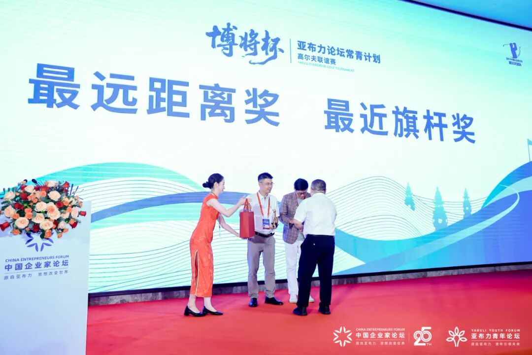 亚布力中国企业家论坛轮值主席/香港交易所原行政总裁/滴灌通创始人李小加、亚布力中国企业家论坛创始人/主席田源、亚布力中国企业家论坛理事/赛富投资基金首席合伙人阎焱、贵州茅台酱香酒营销有限公司副总经理杨秀权、亚布力高尔夫球队队长/博将资本创始人罗阗为获奖球员颁奖。